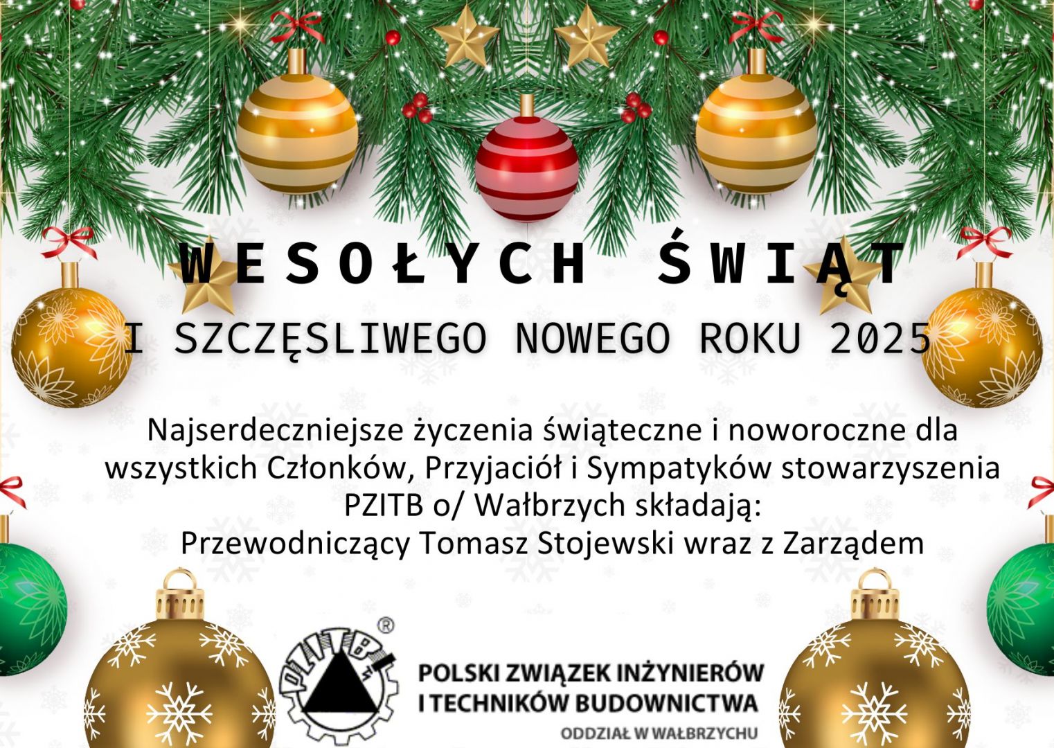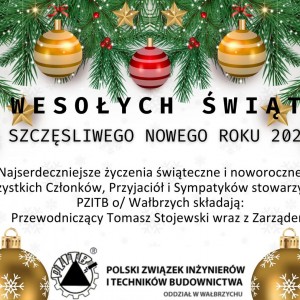 W imieniu OZC Świdnica DOIIB oraz PZITB Oddział w Wałbrzychu zapraszam do udziału w WIGILII BUDOWLANYCH która będzie miała miejsce w dniu 13.12.2024 (piątek) o godzinie 19.00 w GREAT POLONIA ŚWIDNICA (dawny hotel Piast) przy ul. Kotlarskiej 11 w Świdnicy.