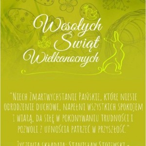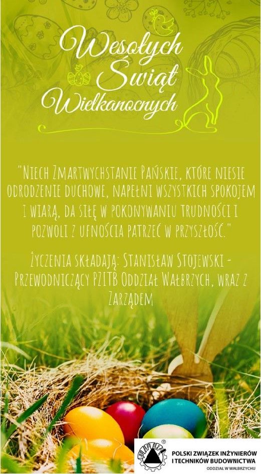 "Niech tajemnica zmartwychwstania Pańskiego umocni wiarę, napełni spokojem, doda siły w pokonywaniu trudności, rozproszy niepokoje i pozwoli z ufnością patrzeć w przyszłość." Życzenia składają: Stanisław Stojewski - Przewodniczący PZITB Oddział Wałbrzych, wraz z Zarządem.